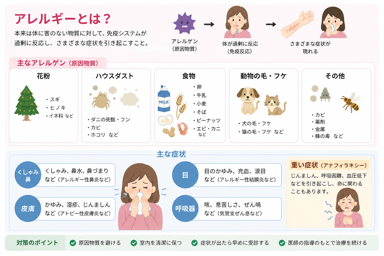 | まれに呼吸器症状 | 重度のアレルギーでは咳・息苦しさも |